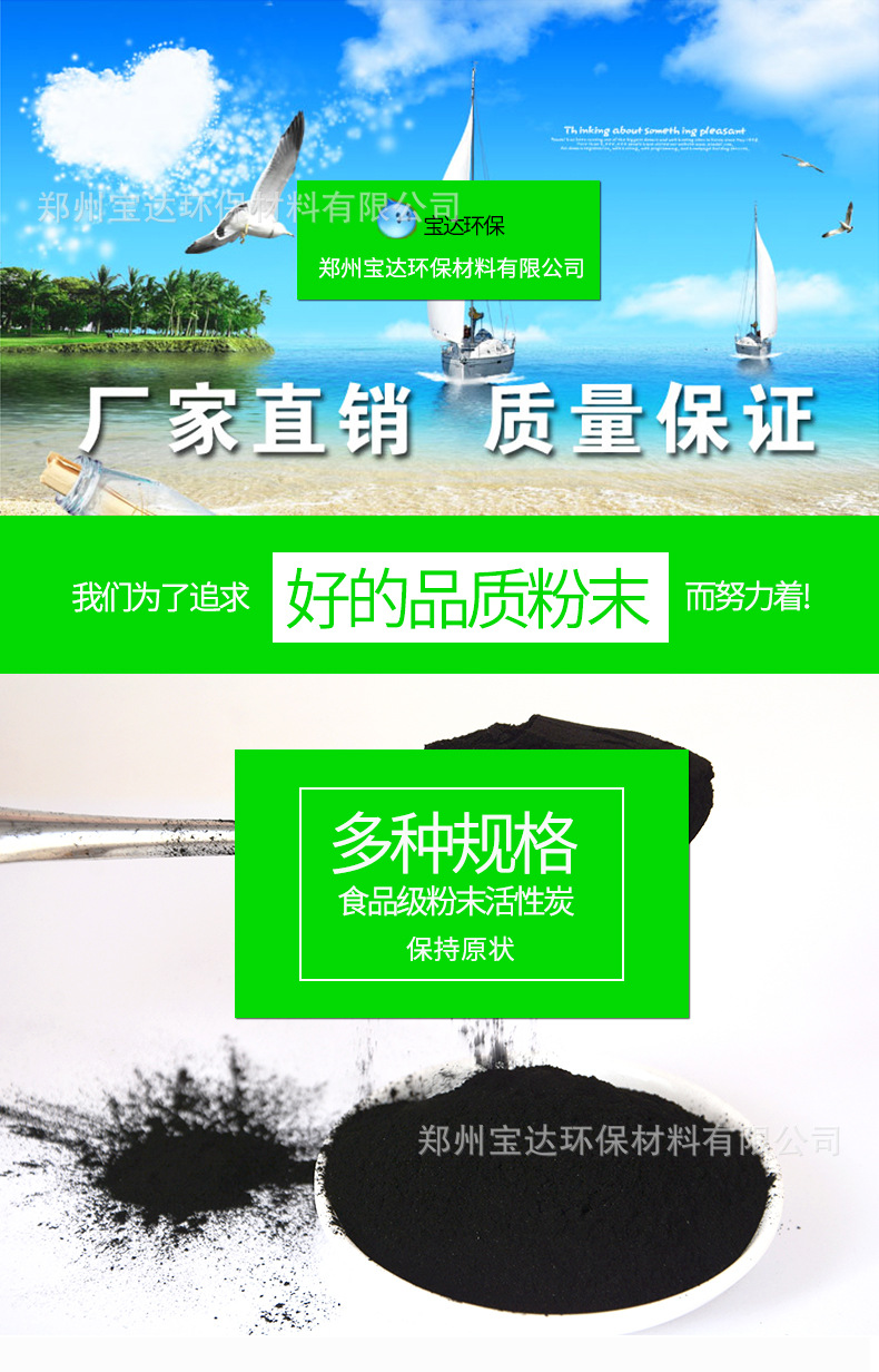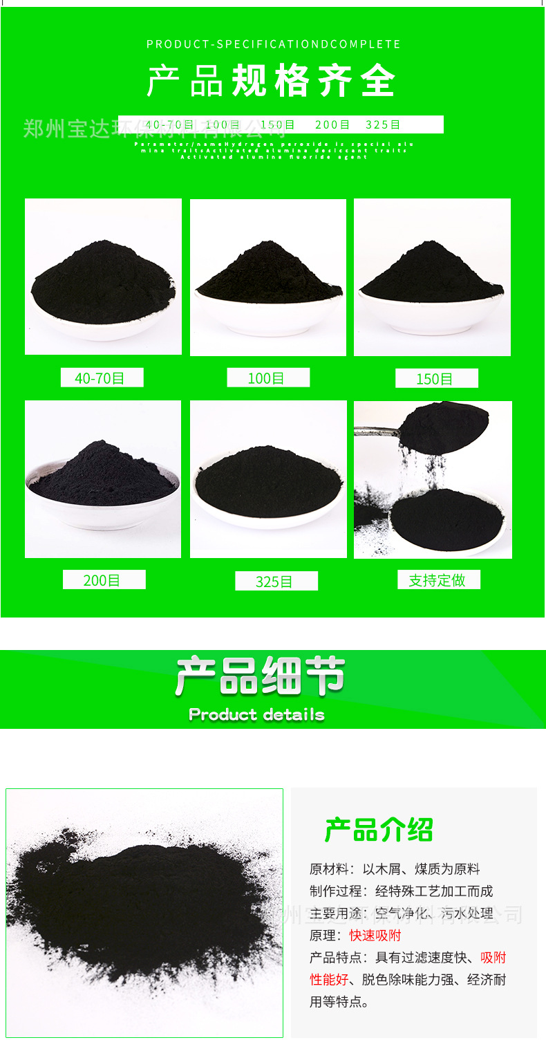 详细信息 产地 河南 是否进口 否 类别 原生碳 货号 BD-6789 品牌 宝达 外观 粉末状 材质 椰壳,木屑,无烟煤 适用行业 化水净气类活性炭 粒度 180-200(目) 水份 5(%) 用途 脱色用活性炭 功能 水质净化