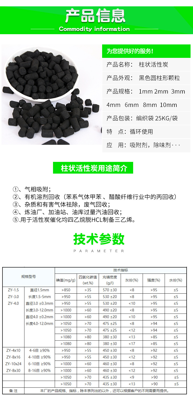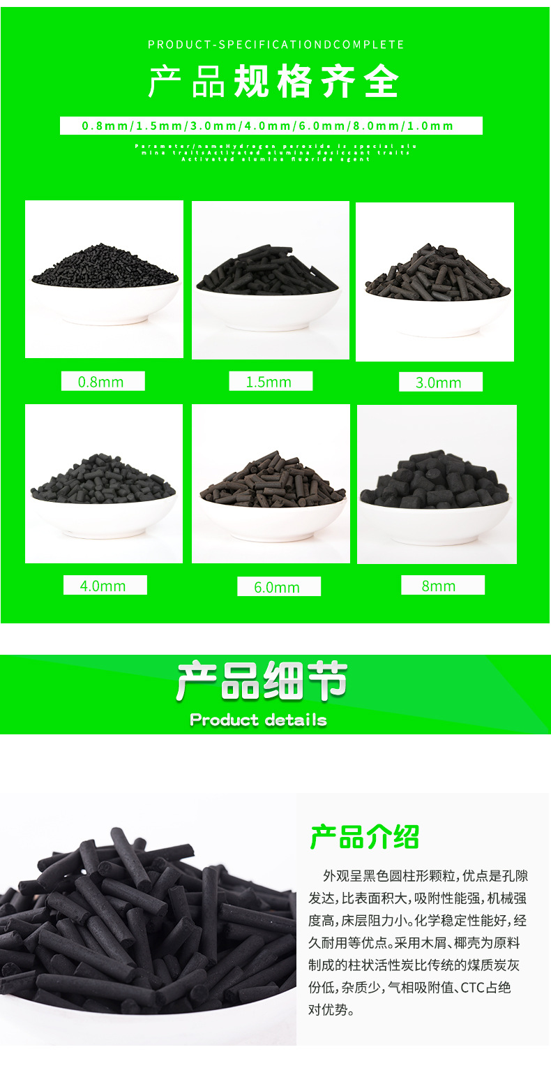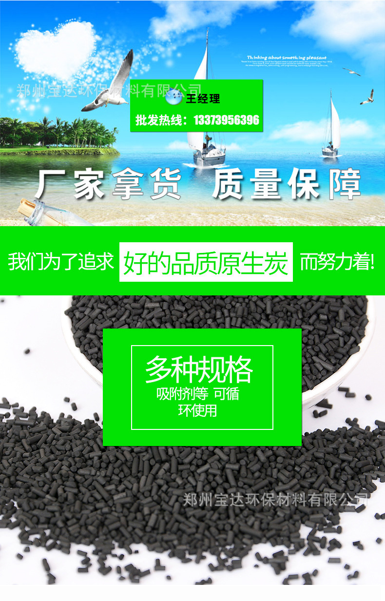 详细信息 产地 河南 型号 BD0012 是否进口 否 类别 原生炭 货号 BD-8667 品牌 宝达 外观 圆柱状 材质 木屑,无烟煤 适用行业 化水净气类活性炭 活性炭吸附剂 高碘值
